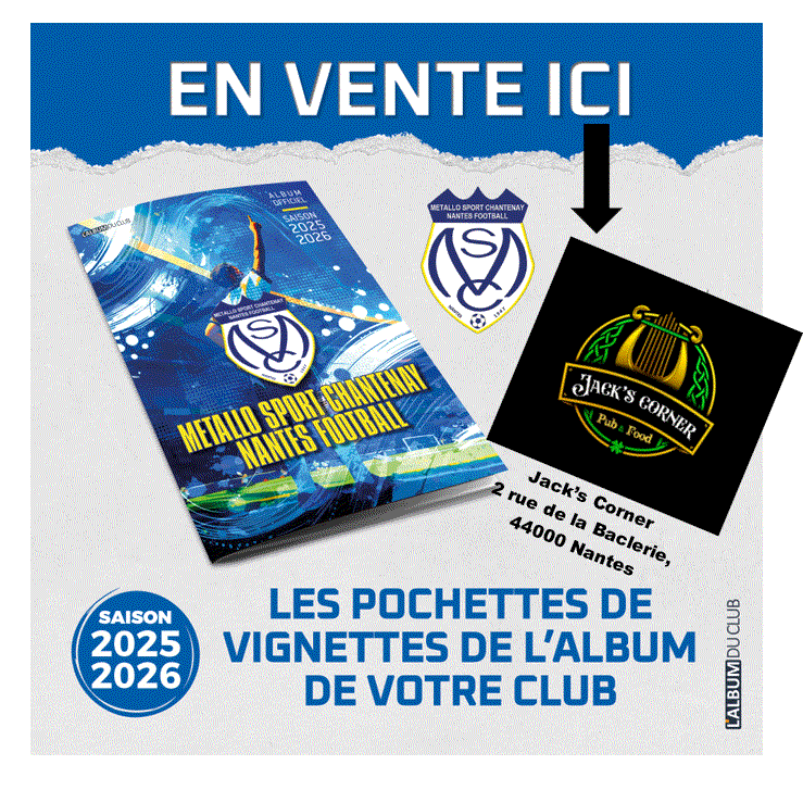 Nous souhaitons vous rappeler que les pochettes de 7 vignettes vendues 1€ sont vendues au Bar du Club et également disponibles, depuis aujourd'hui, chez notre partenaire le Jack's Corner🔥, 2 rue de la Baclerie (quartier Bouffay). Bonne collection 🎉à tous et toutes !!!