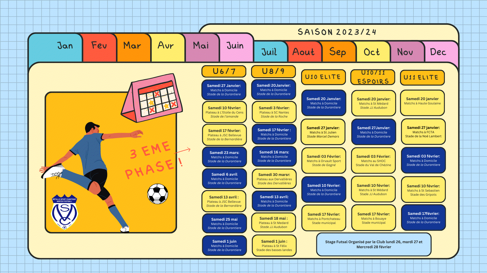 L’objectif de l’école de football est bien sûr d’initier nos plus jeunes licenciés au football, mais également de les sensibiliser aux valeurs véhiculées par le sport : respect de soi-même, des équipiers, des adversaires, des éducateurs, des arbitres, des installations, courage, solidarité et humilité. Du point de vue sportif, le travail des éducateurs est avant tout fondé sur l’amélioration du niveau technique et tactique de chaque joueur.